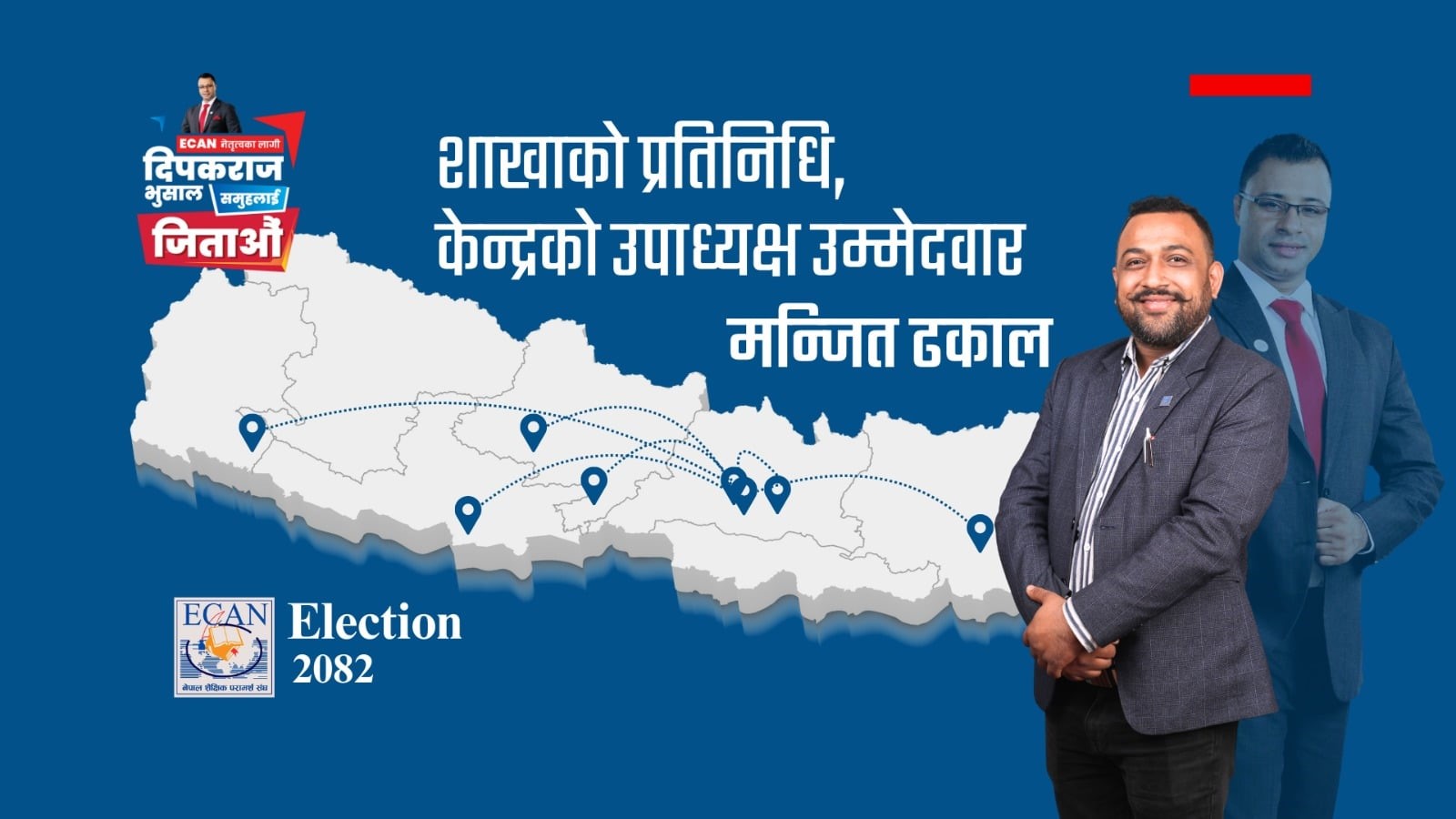 • काठमाण्डौं । नेपाल शैक्षिक परामर्श संघ (ECAN) को आगामी 2082 को केन्द्रीय निर्वाचनमा, मञ्जित ढकालले दीपक राज भुषाल समूहबाट केन्द्रीय उपाध्यक्ष पदमा उम्मेदवारी घोषणा गरेका छन्।