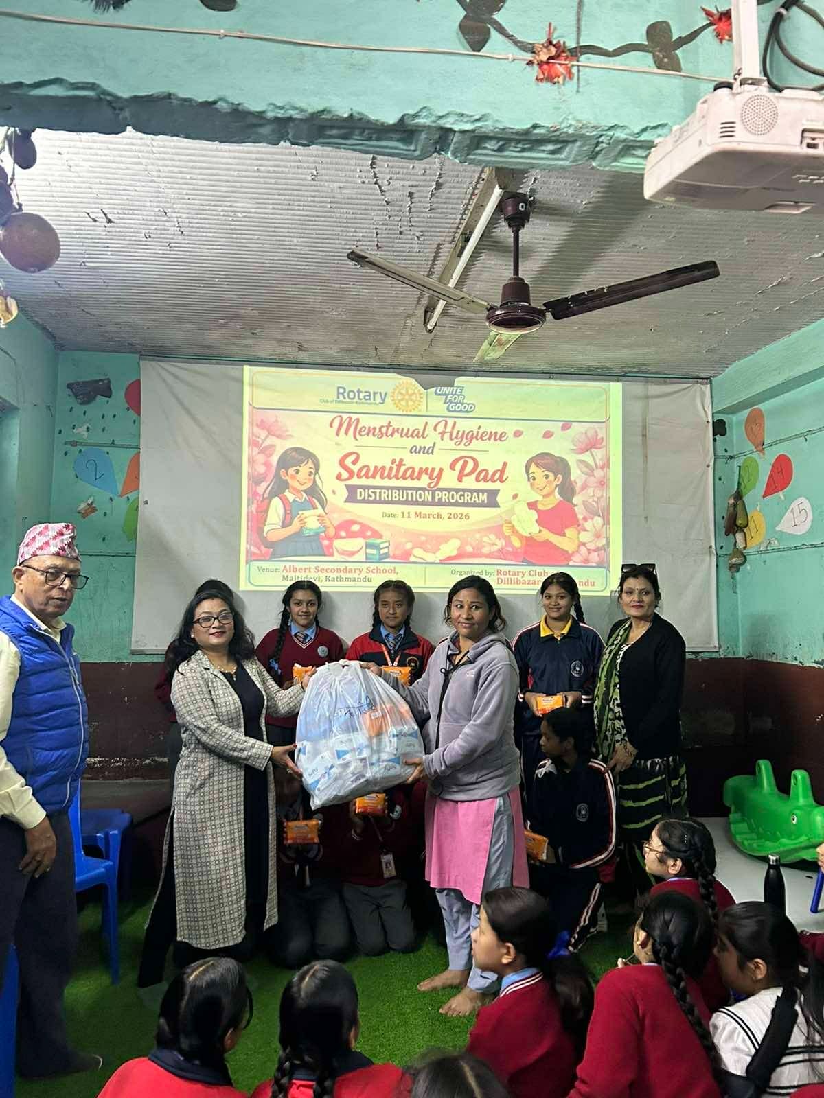 • काठमाडौँ । किशोरीहरूको स्वास्थ्य र स्वच्छताबारे सचेतना अभिवृद्धि गर्ने उद्देश्यले Rotary Club of Dillibazar को आयोजनामा Albert Secondary School, मैतीदेवीमा अध्ययनरत किशोरी विद्यार्थीहरूका लागि “किशोरीहरूका लागि महिनावारी स्वच्छता तथा स्यानिटरी प्याड वितरण कार्यक्रम” सम्पन्न भएको छ।