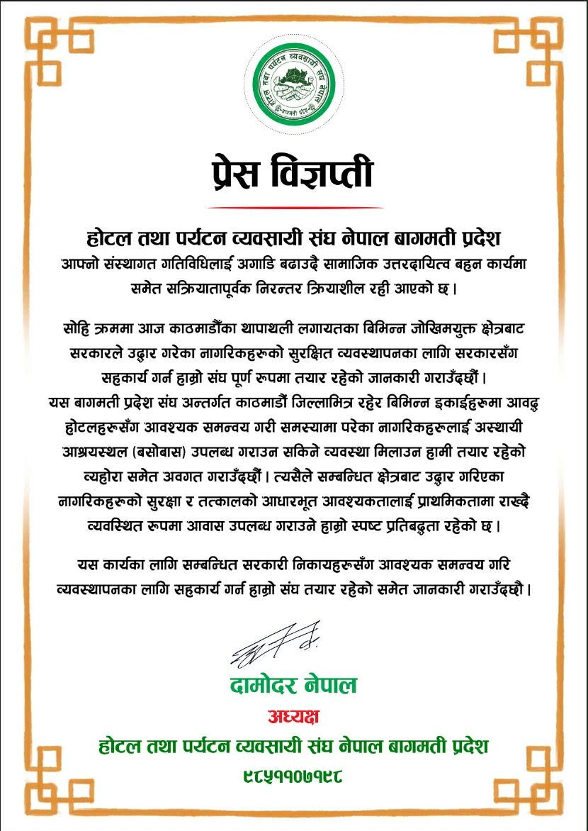काठमाडौं। होटल तथा पर्यटन व्यवसायी संघ नेपाल, बागमती प्रदेशले जोखिमपूर्ण क्षेत्रबाट उद्धार गरिएका नागरिकहरूको सुरक्षित व्यवस्थापनका लागि आफ्ना सदस्य होटलहरूलाई अस्थायी आश्रयस्थलका रूपमा उपलब्ध गराउने तयारी गरेको जनाएको छ।